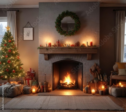 Cozy Christmas scene with a fireplace and festive holiday decorations, christmas, comfortable