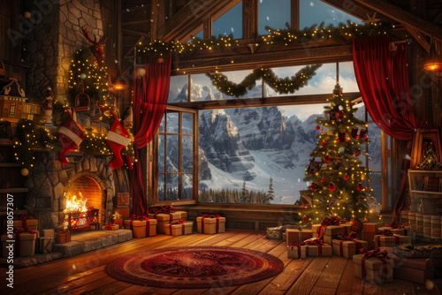 Cozy christmas scene with decorations, a warming fireplace and a christmas tree, Happy christmas, full of seasons greetings