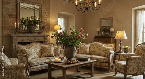interior, living room, room, sofa, armchair, furniture, wood, design, decor, living, style, classic, cosy, flower, vase, lighting, lamp, chandelier, fireplace, beige, brown, light, home, interior design, decorating, home decor, living space, house, table, coffee table, upholstery, indoor, daytime, elegant, comfortable, soft light