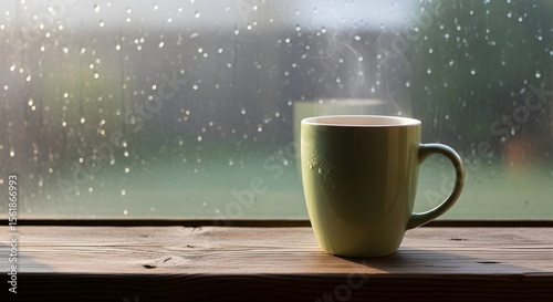 Cozy close-up of a steaming pastel green mug on a wooden windowsill, soft raindrops on glass, blurred misty garden outside, gentle morning light, cinematic depth of field