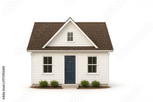 Cozy cottage exterior with white clapboard walls and deep brown cedar shake roof centered composition on white
