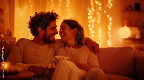 couple, motion picture, night, popcorn, cosy, warm, home, happiness, love, togetherness, indoor, light, evening, relaxation, sofa, smiling, joy, entertainment, romance, lifestyle, intimate, bonding, cheerful, fun, celebration, leisure, friendship, connection, soft, lighting, casual attire, young, adult, decor, family, together, sweet, playful, affection, warmth, comfort, atmosphere, enjoyment, sharing, moment