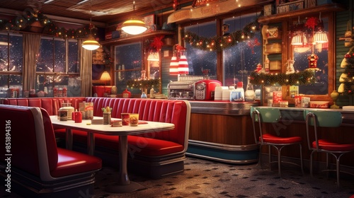 Cozy diner decorated with festive Christmas lights, offering a warm and nostalgic atmosphere perfect for holiday gatherings.