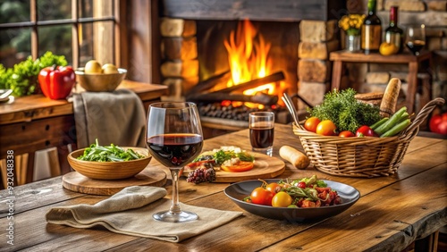Cozy dinner setup on a rustic wooden table with a delicious homemade meal, fresh vegetables, and a glass of red wine in a warm living room.