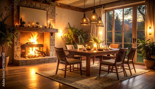 Cozy Evening by Fireplace: Rustic Dining Room Scene.
