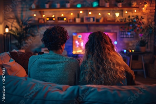Cozy Evening Together: A Young Couple Enjoying a Movie Night at Home with Colorful Lights and a Warm Atmosphere in a Modern Living Room