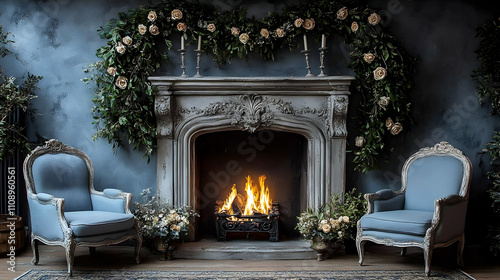 Cozy Fireplace Scene with Antique Chairs & Floral Decor