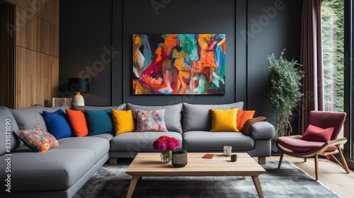 cosy, grey, wood, illustration, accent, wall, living, room, photograph, plush, sofa, vibrant, artwork, contrast, cool, tone, bold, colours, depth, character, space, modern, sophisticated, ambience, background, decor, interior, design