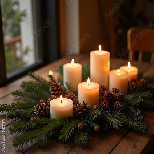 cosy, holiday, ambience, candle, pine cone, rustic, table, warm, festive, winter, decoration, glowing, home, decor, peaceful, serene, tranquil, wooden, light, flames, chaplet, green, celebration, inviting, natural, seasonal, intimate, charme, atmosphere, indoor, soft, relaxing, arrangement, gathering, christmas, evergreen, classic, calm, ornamental, nature, aesthetic, warmth