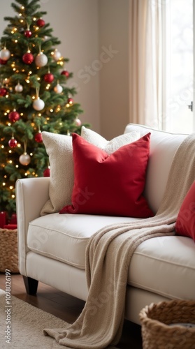 sofa, christmas tree, holiday decorations, present