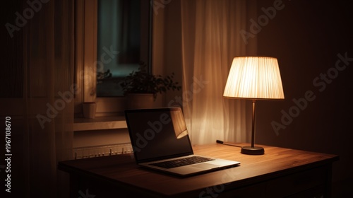 Cozy Home Office Night Scene Laptop with Lamp, and and Window Glow.