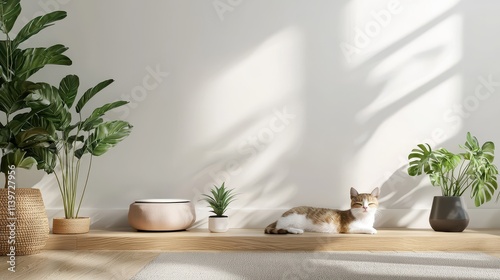 Cozy Indoor Living Space with Cat and Green Plants bathed in Soft Natural Light