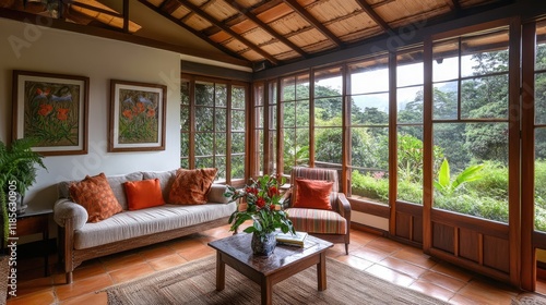 Cozy interior of a healing space with natural light overlooking lush cloud forest landscape and inviting seating for relaxation