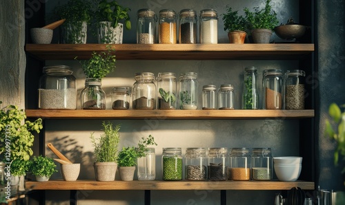 cosy, kitchen, corner, wooden, shelf, filled, glasses, jar, ceramic, dish, herb, soft, ambient, lighting, food, home, background, jar, cook, design, interior, white, tomatoes, product, table, healthy, wood, pepper, ingredient, homemade, container, decor, shelf, vegetable, green, organic