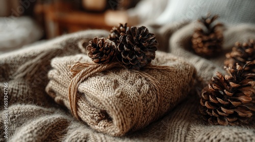 knitted, bundle, beige, warm, pine, cone, gift, cosy, autumn, winter, decor, rustic, home, textile, threaded, woven, craft, natural, wrapped, tied, brown, soft, texture, hand-made, detail, closeup, relaxing, comfort, atmosphere, interior, decoration, autumn, holiday, gift wrap, fiber, material, woolen, warmth, softness, decorative