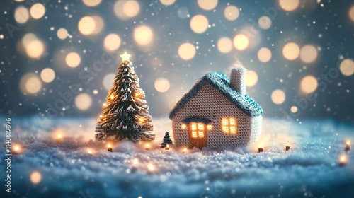 Cozy knitted house with Christmas tree and snowfall during festive season.