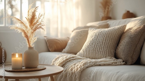 Cozy Living Room Interior Design with Pampas Grass and Knitted Pillows