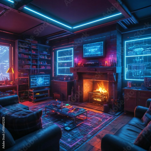 Cozy Living Room with Cyberpunk Fireplace