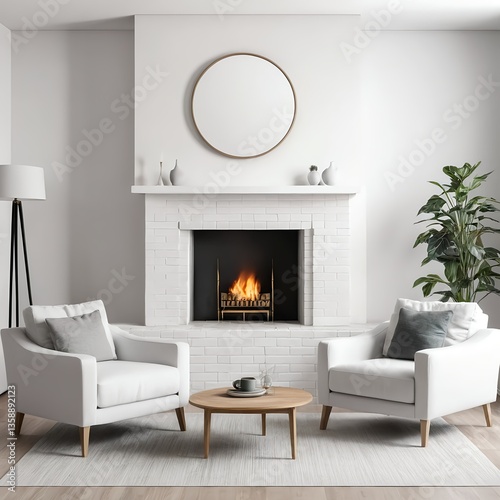 living room, fireplace, fire, white, modern, minimalist, contemporary, interior, home, decor, furniture, armchair, chair, coffee table, rug, carpet, plant, greenery, vase, mirror, mantel, cosy, comfortable, relaxation, calm, serenity, scandinavian