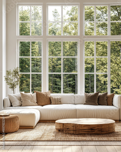 Cozy living room with large windows showcasing a lush green outdoor view in bright daylight