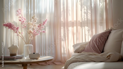 living room, cosy, floral arrangement, dried flowers, wooden table, sunlight, tranquil, relaxing, minimalism, elegant, natural light, feminine, comfortable, chic, serene, home interior, peaceful, stylish, bright, simplicity, inviting, pastel, calming, contemporary, homelike