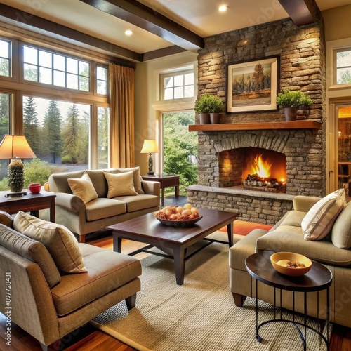 Cozy Living Room with Stone Fireplace and Natural Light, fireplace, living room, interior design, home decor