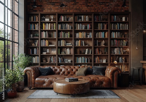 Cozy Living Room with Vintage Leather Sofa, Wood Shelves, and Abundant Books in a Stylish Industrial Setting