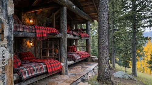 cabin, bunk, bed, plaid, blanket, log, exterior, rustic, wood, stone, architecture, nature, forest, tree, landscape, shelter, accommodation, lodging, retreat, vacation, get-away, tour tourism, travel, comfortable, cosy, warm, light, lamp, lantern, pillow, design, furniture, home, house, building, structure, construction, column, mountain, hillside, autumn, yellow, foliage, countryside, scenic, view, tranquil