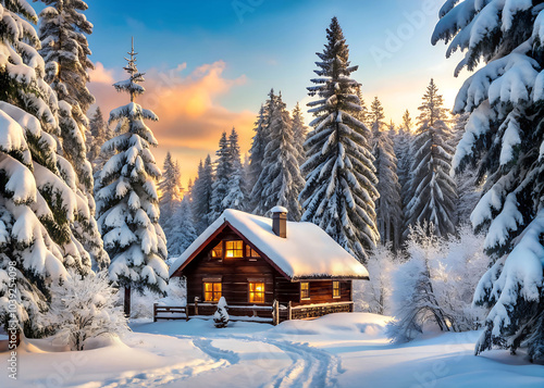 Cozy log cabin in snowy forest at sunrise. Winter retreat and serene nature concept.