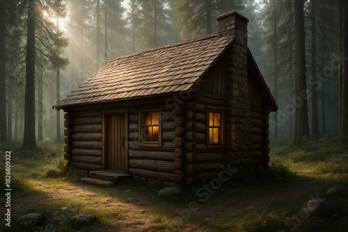 Cozy log cabin nestled in a serene forest with warm inviting light