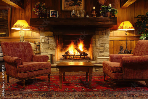 lounge, fireplace, cosy, conversation, area, warm, seating, chair, wooden, rustic, home, interior, decor, lighting, comfortable, living room, red, carpet, stone, wood, ambience, inviting, traditional, furniture, relaxation, warmth, atmosphere, design, stylish, elegant, peaceful, intimate, hearth, flames, evening, soft, glow, vintage, charming, homelike, natural, element, accessory, plant, art, wall, picture, lamp, texture