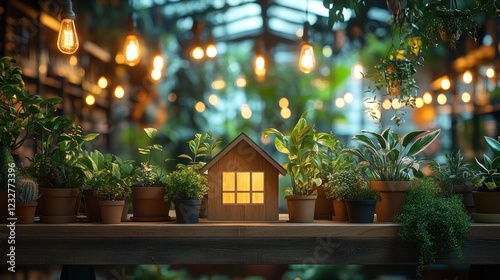 home, house, plant, pot, green, light, cosy, warm, wooden, miniature, interior, garden, nature, lighting, bulb, decoration, design, eco, sustainable, lifestyle, comfort, serenity, calmness, growth, spring, summer, autumn, winter, background, image, photo, picture, scene, setting, ambience, atmosphere, foliage, vibrant, bright, dark, rustic, shelf, table