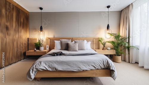 Cozy minimalist bedroom. Hotel room.