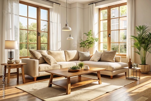 Cozy minimalist living room with cream sofa, wooden coffee table, and neutral colors, surrounded by large windows and flooded with natural light.