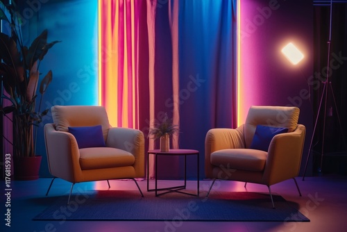 Cozy minimalist studio. Empty studio without people. Studio for podcasts or interviews. Stylish studio. Two comfortable armchairs with lighting and a coffee table