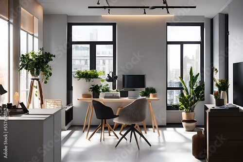 home office, desk, apartment, window light, computer, modern, plant, computer monitor, window, workspace, no people, office, chair, lamp, cosy, indoor, working, lifestyle, furniture, business, small business, technology, day, office chair, rug, home interior, domestic life, table, home decor, color image, flooring, horizontal, copy space, photo, house, desktop pc, potted plants, armchair, background, cabinet, comfortable, interior