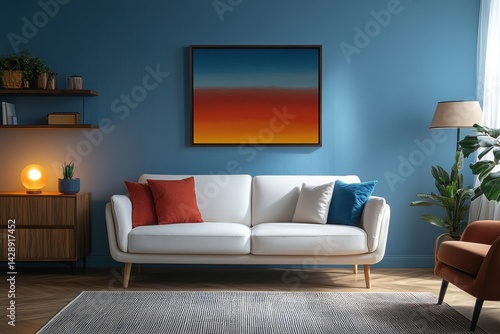 Cozy modern living room featuring a white sofa and vibrant blue walls with stylish decor elements