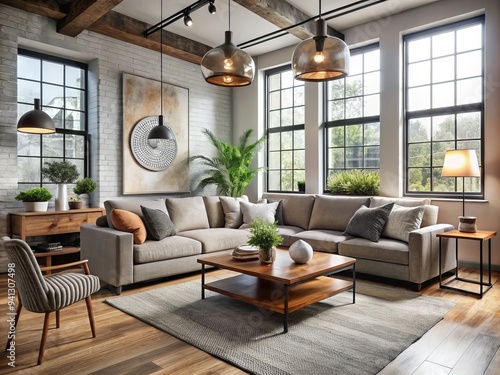 Cozy modern living room renovation combining neutral color palette with industrial style furniture and statement lighting