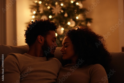 Cozy moment shared by couple, illuminated by soft holiday lights