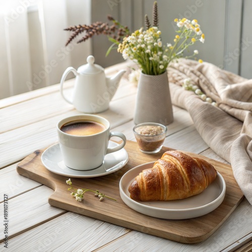 Cozy Morning Breakfast with Coffee and Croissant on Wooden Table in Natural Light