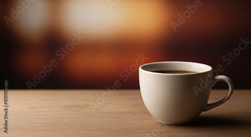 Cozy morning coffee in a white mug on a wooden table with warm blurred background