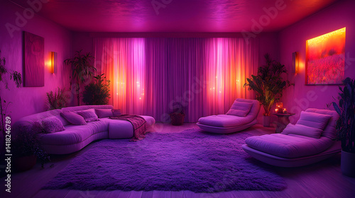 living, room, interior, design, modern, cosy, lounge, sofa, chair, relaxation, ambient, lighting, night, colours, purple, pink, orange, warm, home, decor, furniture, plant, art, cushion, rug, contemporary, ambience, texture, soft, minimalist, evening, relaxing, space, style, stylish, comfortable, luxury, accessory, artwork