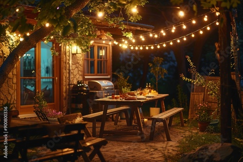 cosy, night time, bar-b-q, string, light, dining, ambience, warm, inviting, rustic, wooden, picnic, table, glowing, lantern, grill, garden, evening, illumination, atmosphere, festoon, dinner, gathering, patio, bench, celebration, event, decor, charming, serene, peaceful, backyard, festive, party, leisure, meal, summer, relaxation, decorative, friendly