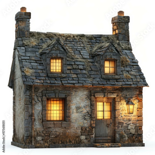 Cozy old stone fantasy house with glowing windows at night, isolated on white