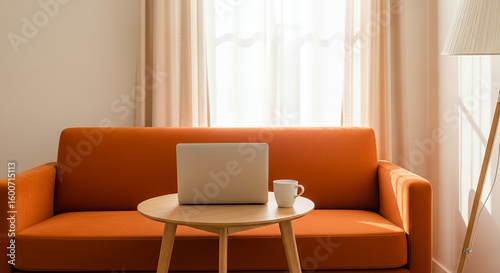 sofa, orange, laptop, table, home decor, cosy, warm colors, interior design, natural light, casual attire, comfortable, workspace, relaxing, furniture, modern, stylish, coffee cup, aesthetic, inviting, cheerful, home office, simplicity, vibrant, living room, decor, fresh, homelike, design element, leisure, functionality