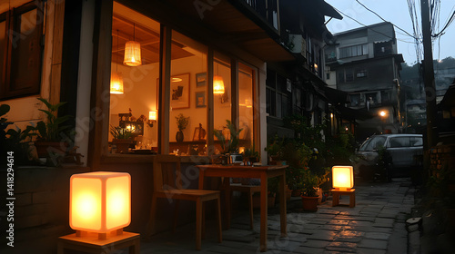 Cozy outdoor cafe at dusk in a charming Asian alleyway, illuminated by warm lanterns. Tables and chairs are set for diners.