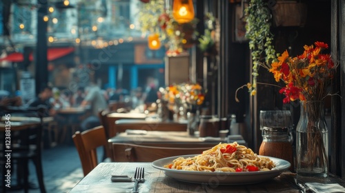 spaghetti, cosy, coffee, table, atmosphere, lighting, lively, warm, ambient, evening, dining, food, eatery, floral, decor, chair, table, people, background, bokeh, string, light, city, urban, cookery, meal, pasta, setting, inviting, casual attire, seating, decoration, potted, plant, ambience, culinary, eating, establishment, leisure, vibrant, social, gathering, relaxation