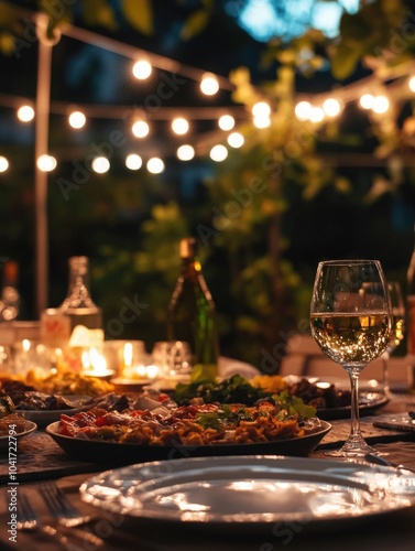 dinner, casual attire, gathering, table, setting, food, drink, candle, light, evening, socialising, fresh, air, nature, greenery, relaxation, bottle, wine, glasses, plate, fork, knife, spoon, cooking, eating, leisure, al, fresco, homelike, comfortable, luxury, epicure, vinery, celebration, wedding, anniversary, romantic, night time, backyard, patio, seating, chair, pizza, italian, cookery, bar-b-q, grill, summer