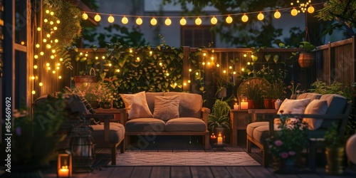 patio, string, light, candle, cosy, furniture, night, dark, warm, inviting, comfortable, relaxing, garden, outdoors, wood, plant, flower, couch, cushion, table, lantern, wooden, greenery, romantic, ambience, evening, chill, relax, summer, twilight, rustic, decor, home, style, design