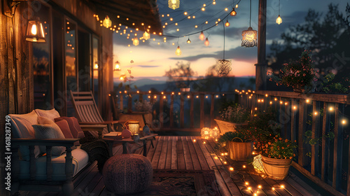 Cozy porch oasis illuminated by warm string lights at sunset, creating a magical evening ambiance